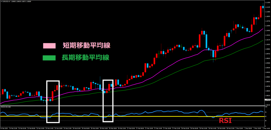 移動平均線、RSIについて詳しく知りたい方はこちらを参考にしてみてください。