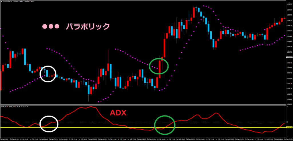 ですのでSARとローソク足が交差して、さらにADXの数値が20を超えていた場合にエントリーチャンス、ということになります。