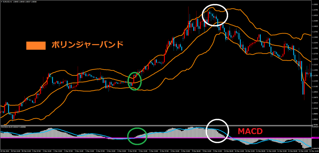 逆に、ボリンジャーバンドの逆張りエントリーの使い方としては、白色丸部分の状況になったときです。ボリンジャーバンドが+2σタッチして、なおかつMACDが0ラインより上でデッドクロスしています。売りポイントの目安です。